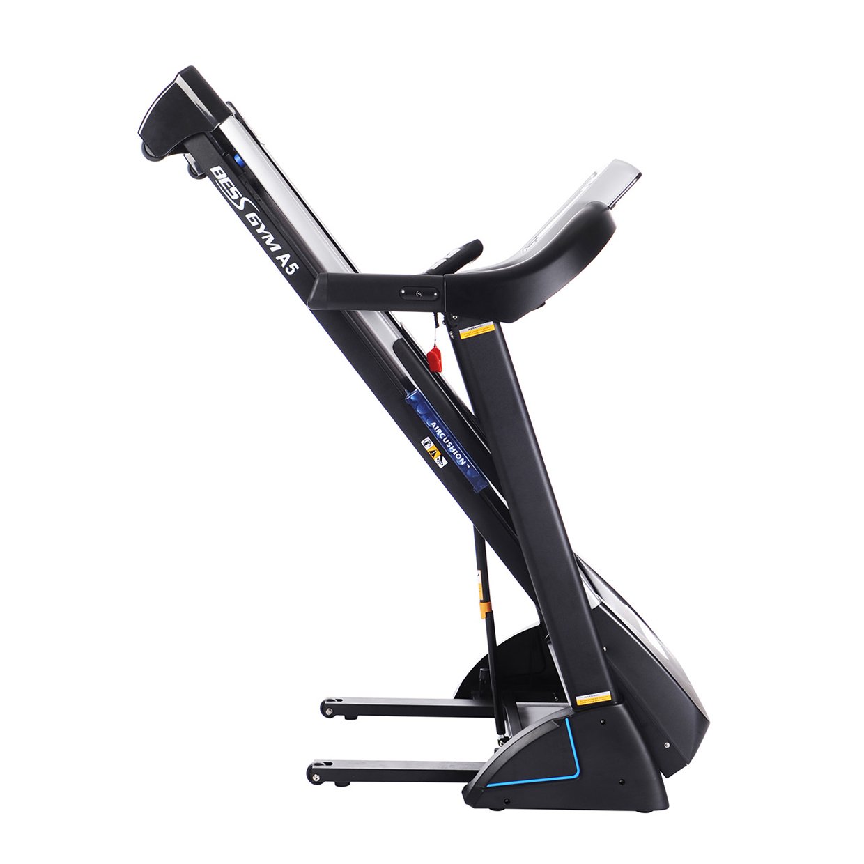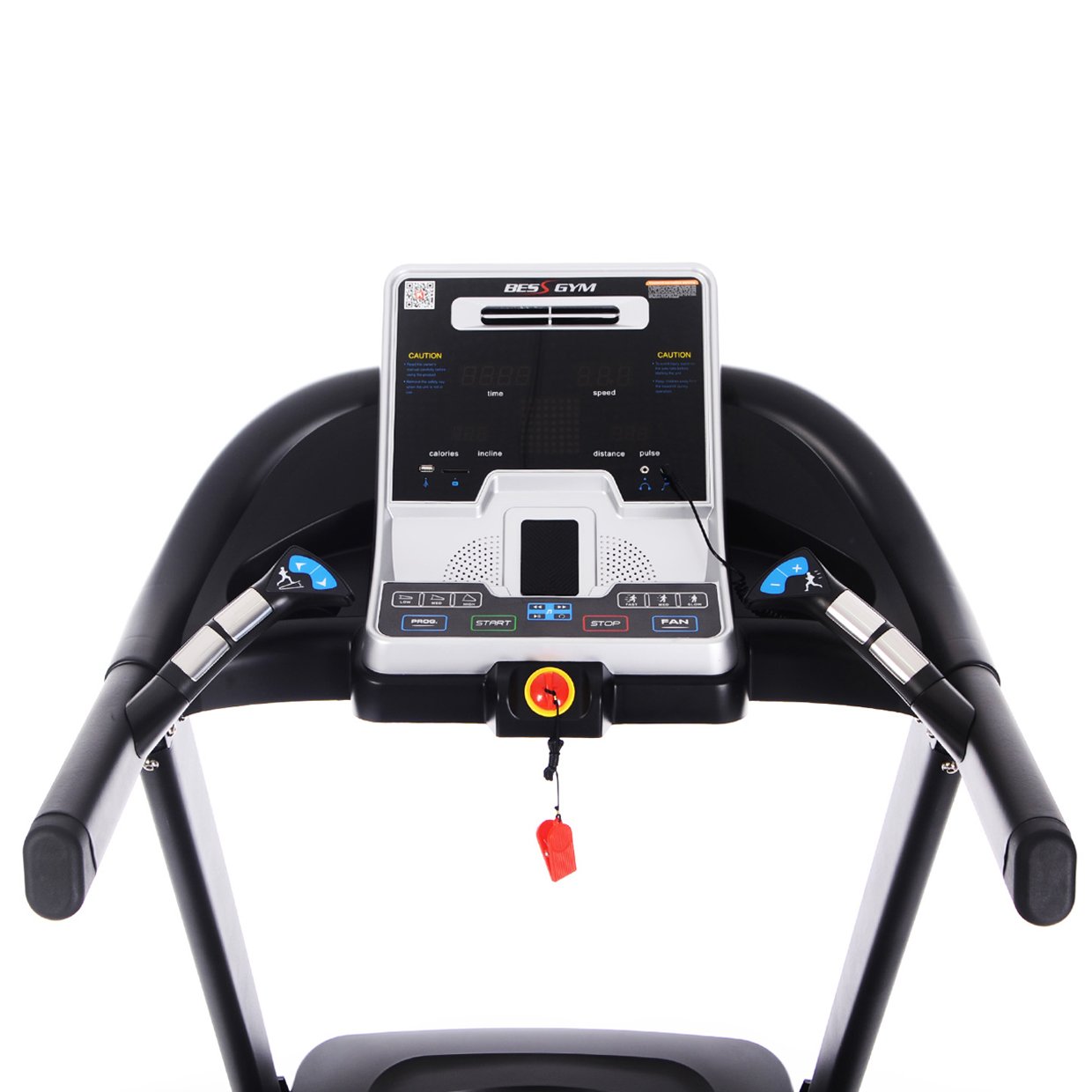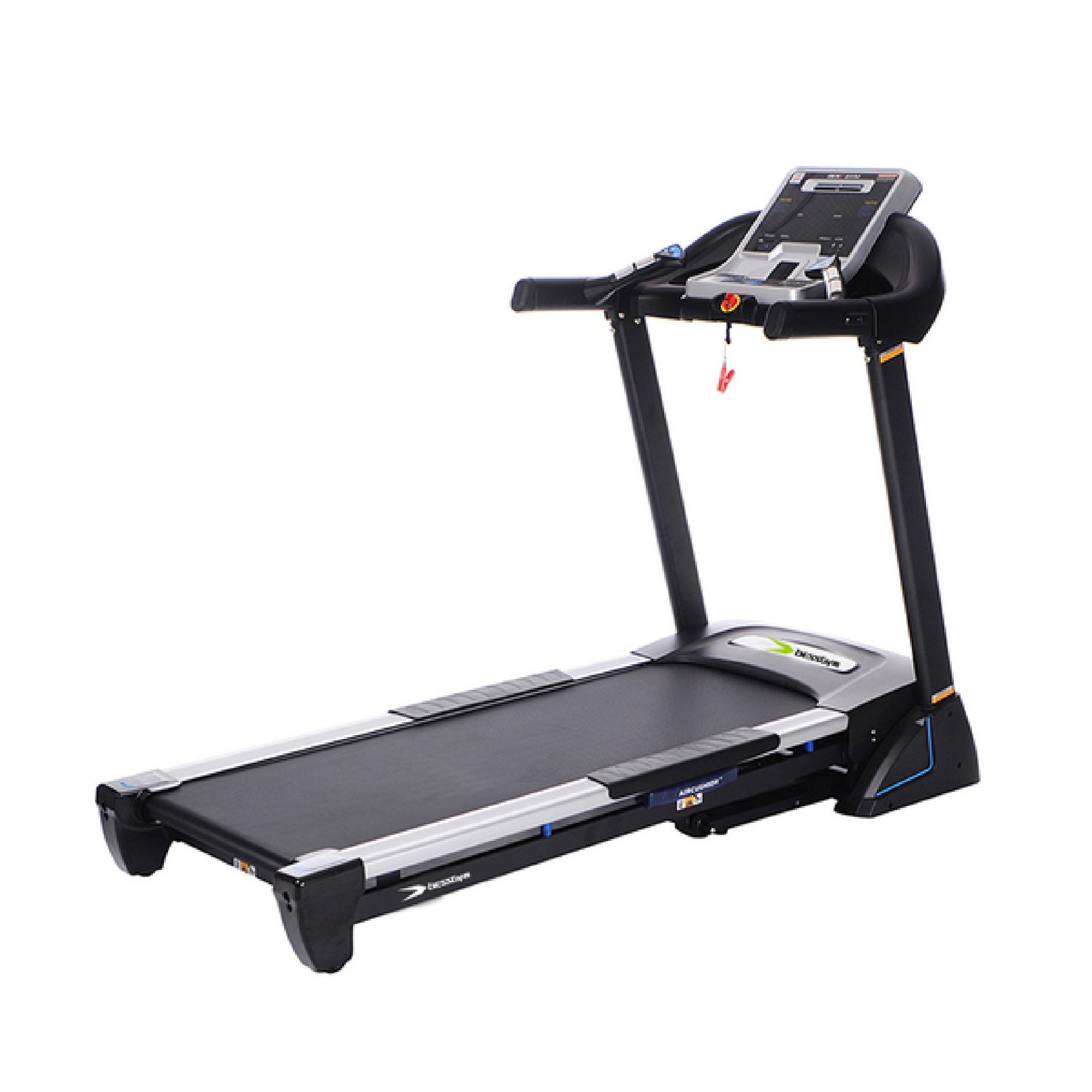 Moteur semi-professionnel AC 3,5CV en pic, vitesse max. 20km/h, surface de course 140*51cm, 20 programmes de course, capteurs cardiaques, pliable, inclinaison électrique jusqu’à 15% d’inclination, sortie jack avec des haut-parleur.